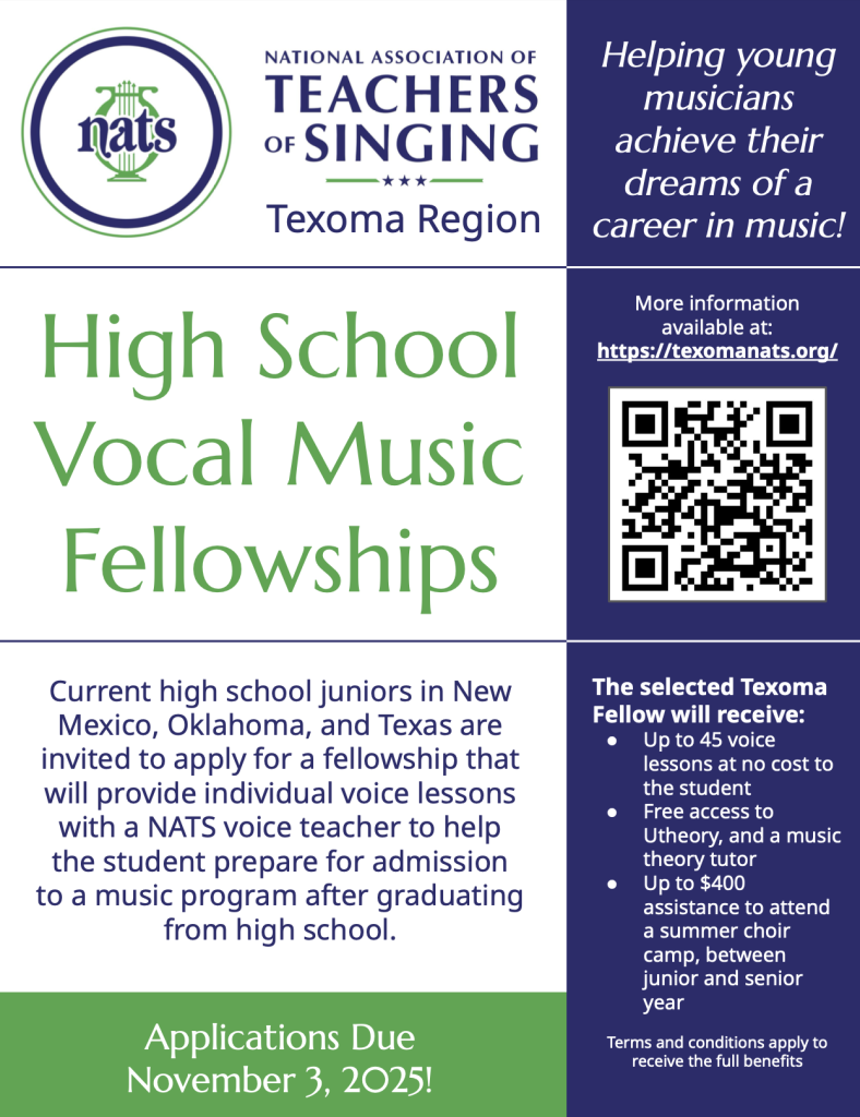 The National Association of Teachers of Singing, Inc (NATS) was founded in 1944 and is now the largest association of teachers of singing in the world. The Texoma Region is one of the largest regions in the country by membership. Read More
